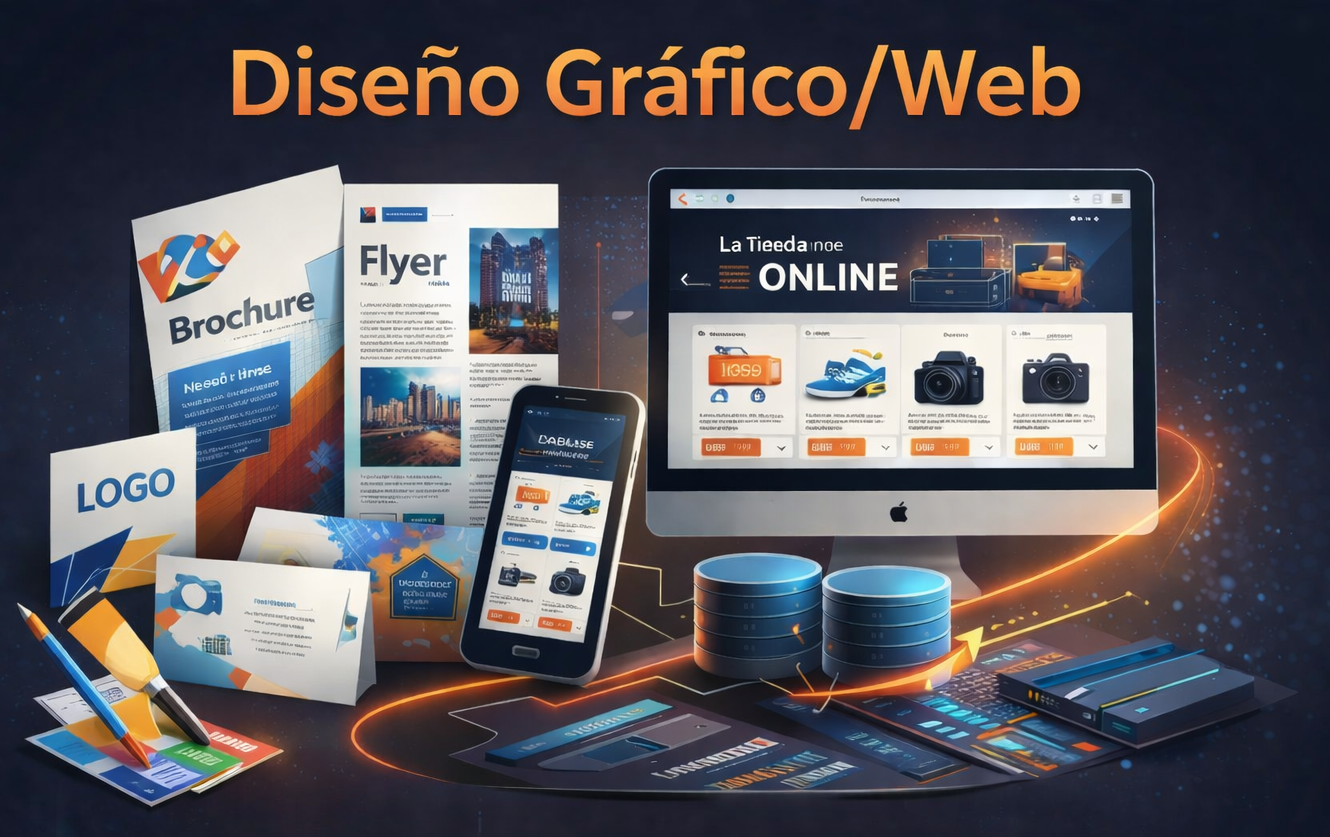 Diseño corporativo y digital, cubriendo necesidades que van desde la creación de un logo, brochure o flyer, hasta el desarrollo de plataformas de ventas online integradas con bases de datos, soluciones de presencia web, materiales de promoción comercial y aplicacionescliente-servidor / web.